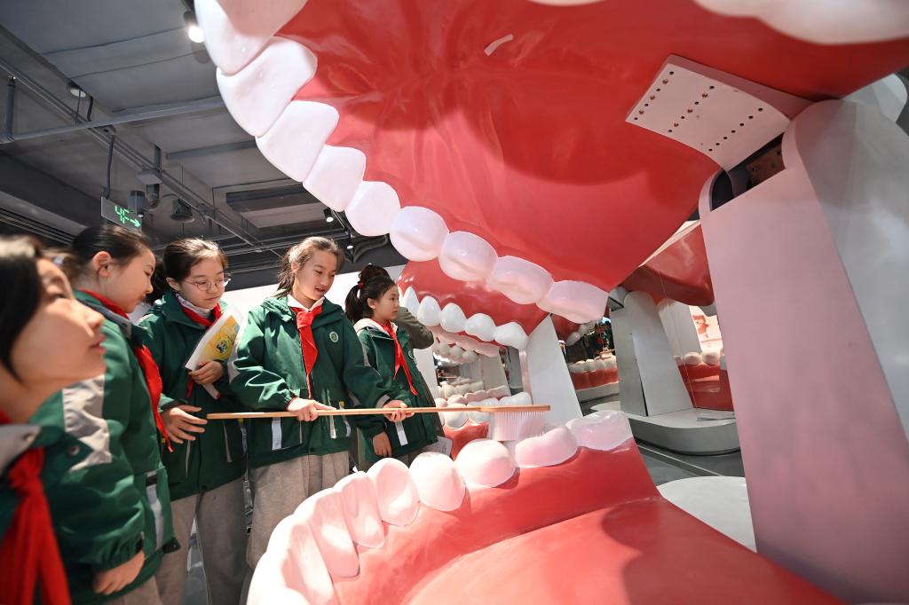 陕西省西安市新城区通济坊小学的学生在西安交通大学口腔病院口腔科普教师基地学习正确的刷牙要津。新华社记者 李一博 摄