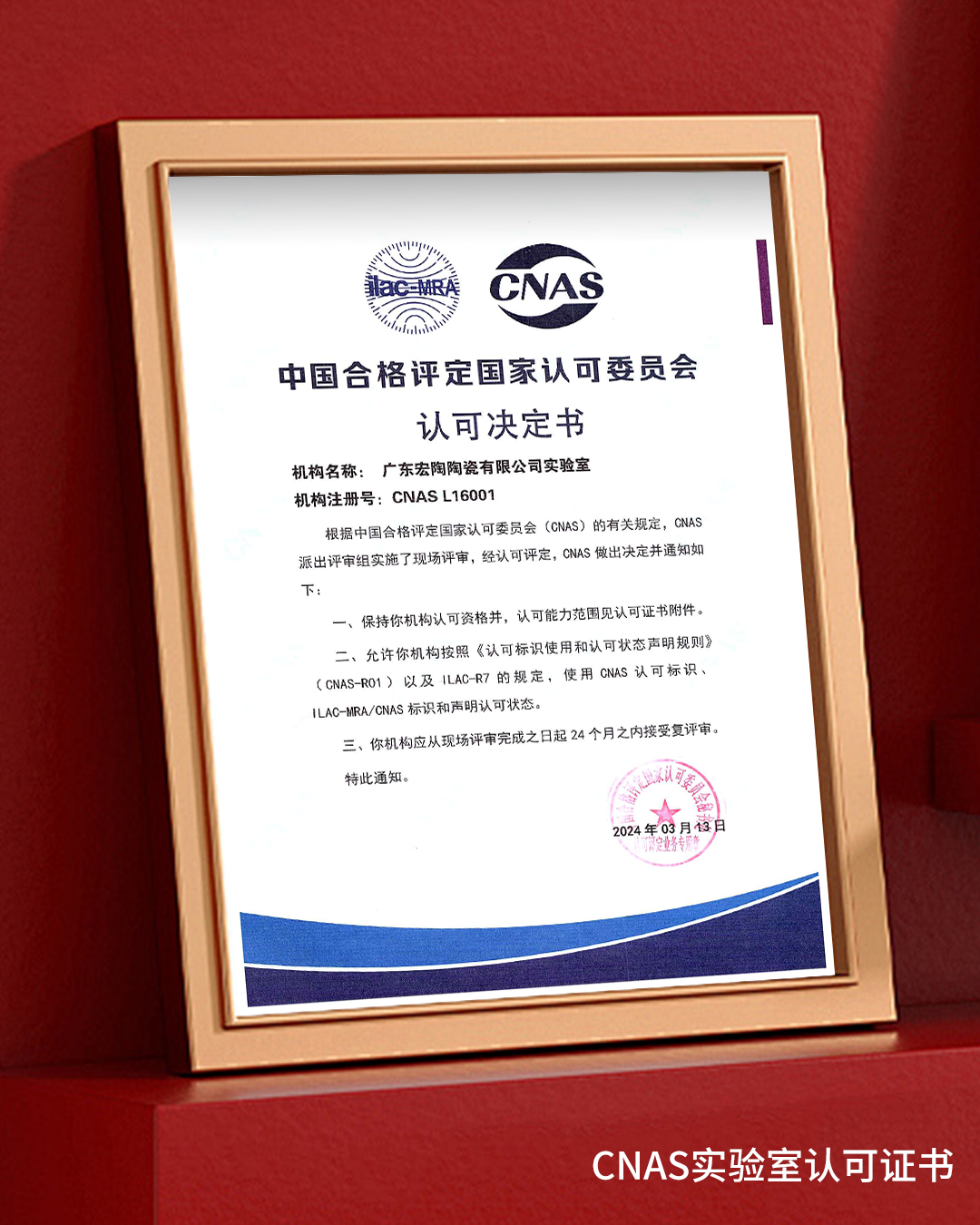 此外,宏陶瓷砖依托国度CNAS认阐明验室,深度和会巨擘高校的产学研合营,系统化考证产物强度、耐磨、防滑、耐化学腐蚀等维度的性能,不仅为5A品性提供坚实的科学撑执,更执续鼓动宏陶产物创新与时期迭代。